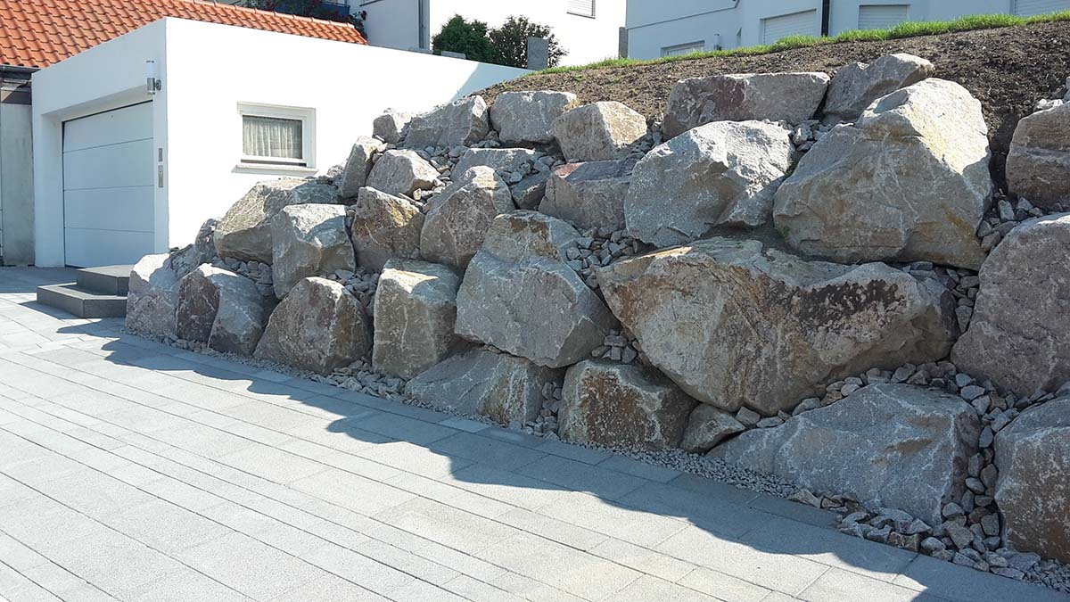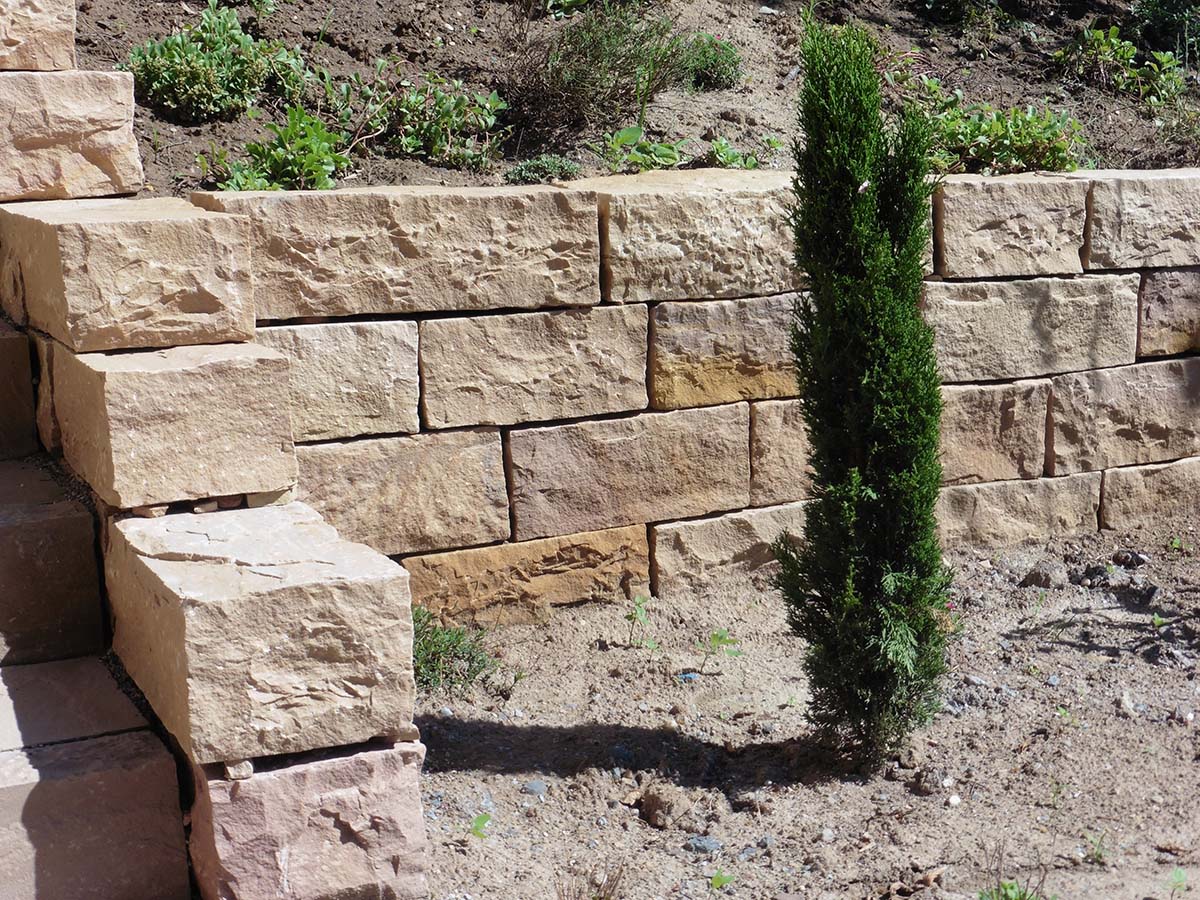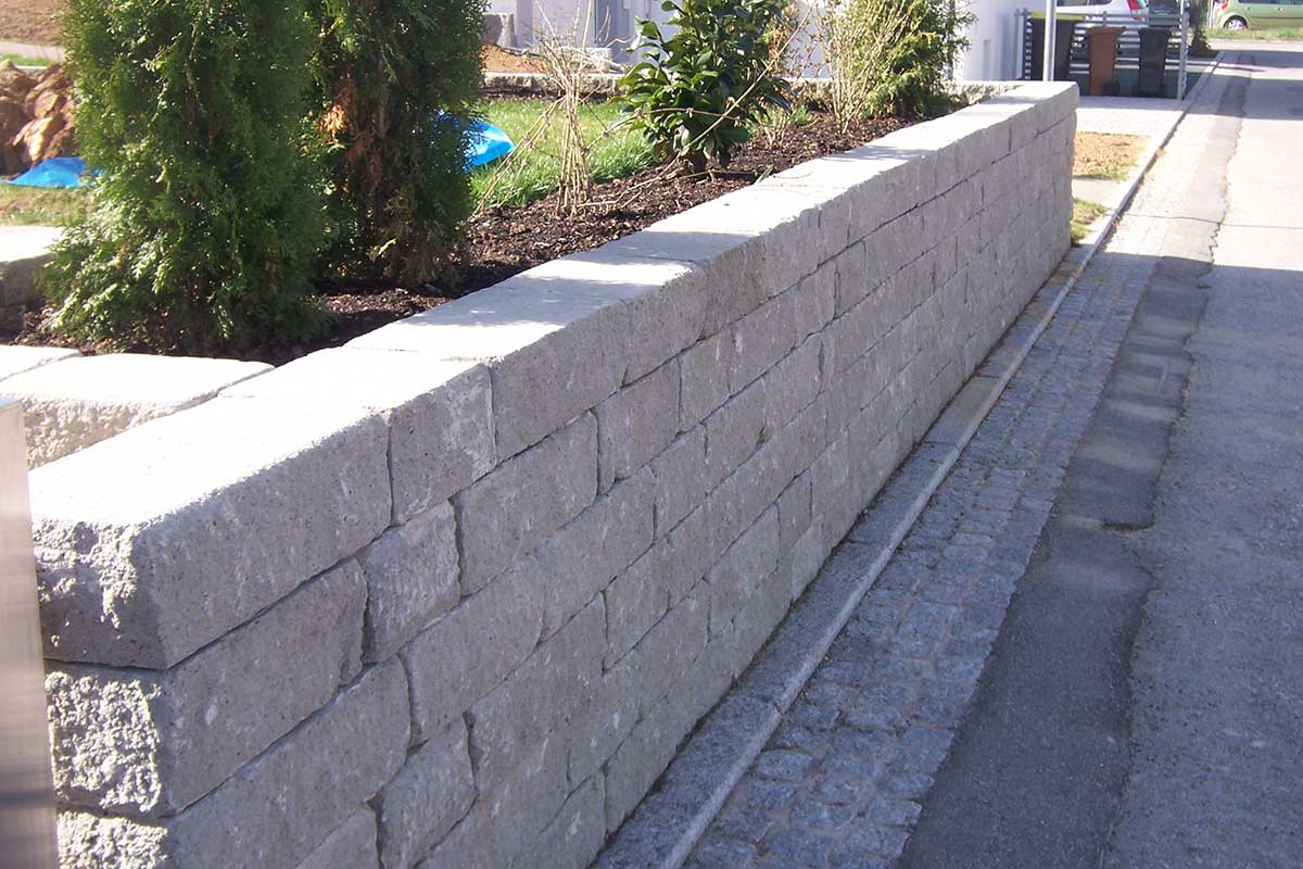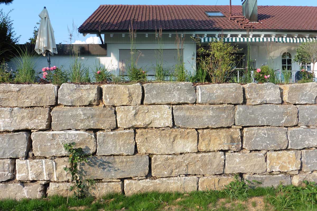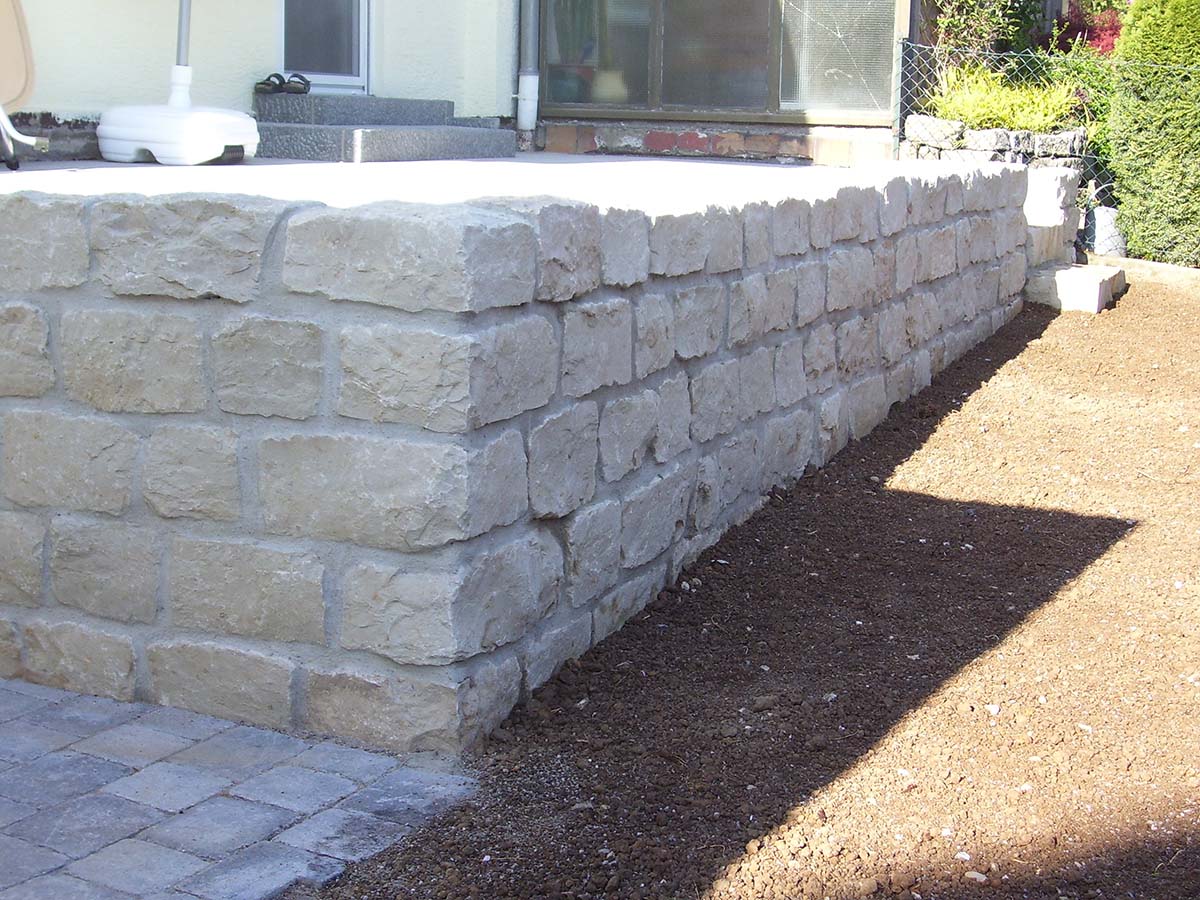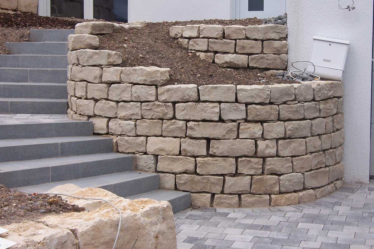 Mauern können als Trockenmauer aus Natursteinmauersteinen oder –Felsen erstellt werden und dienen zusätzlich mit den dazu passenden Pflanzen auch noch der Natur. Oder aus natursteinähnlichem Betonstein, mit oder ohne Hinterbetonierung.
