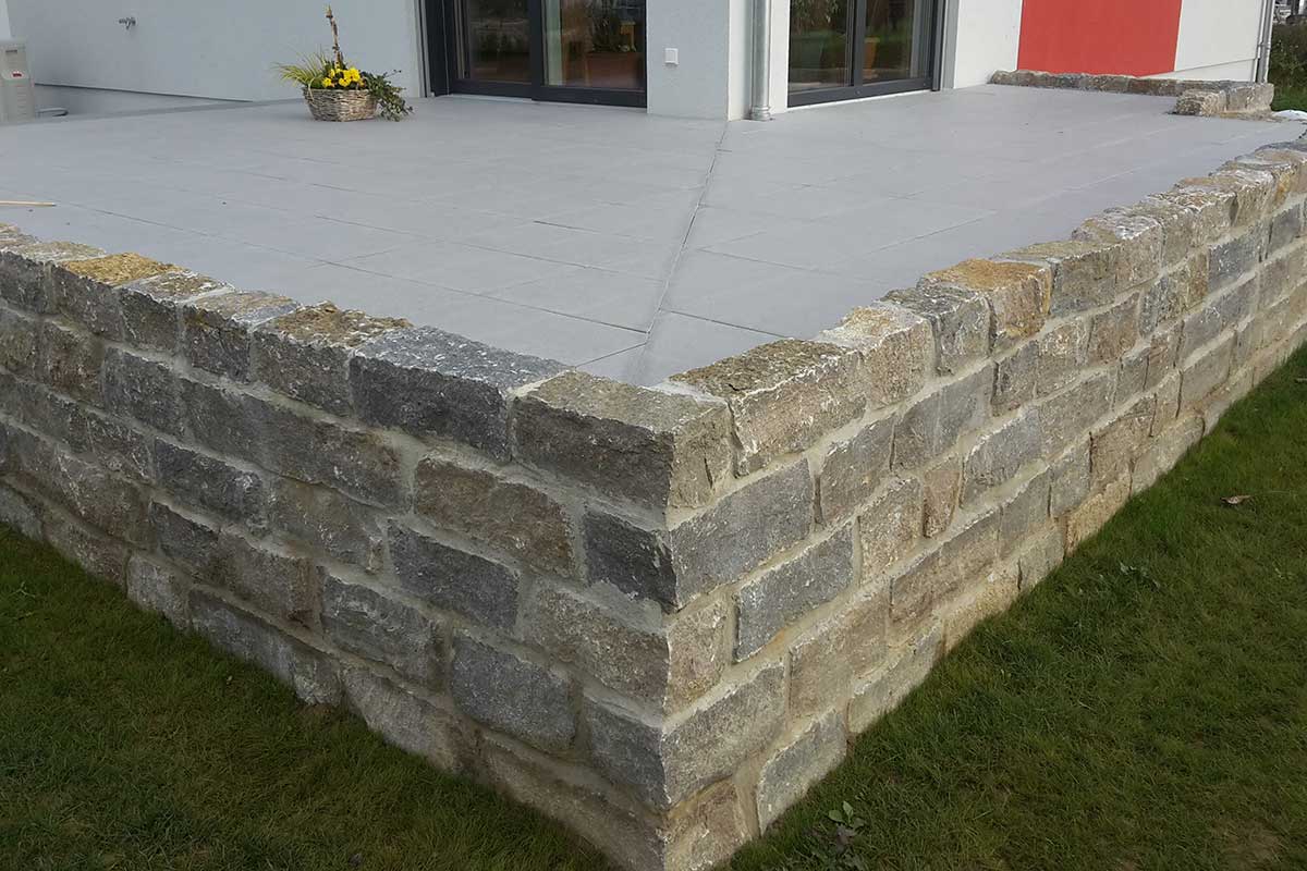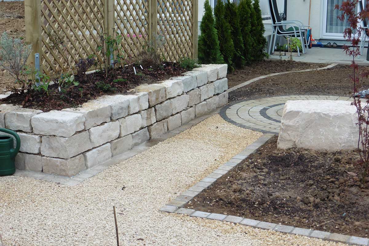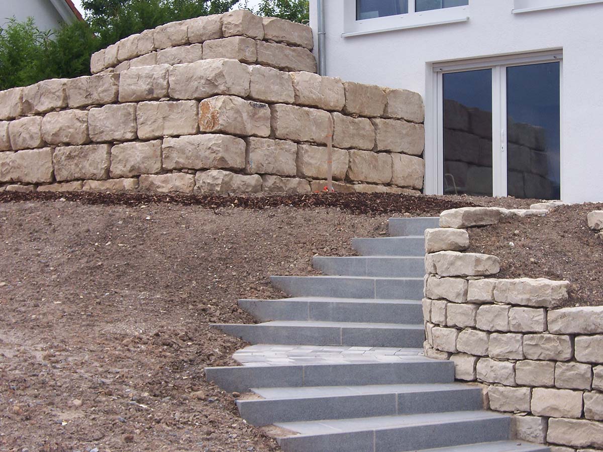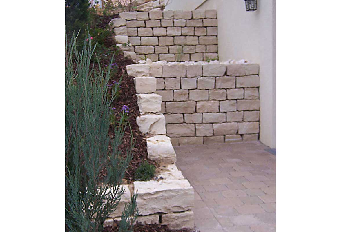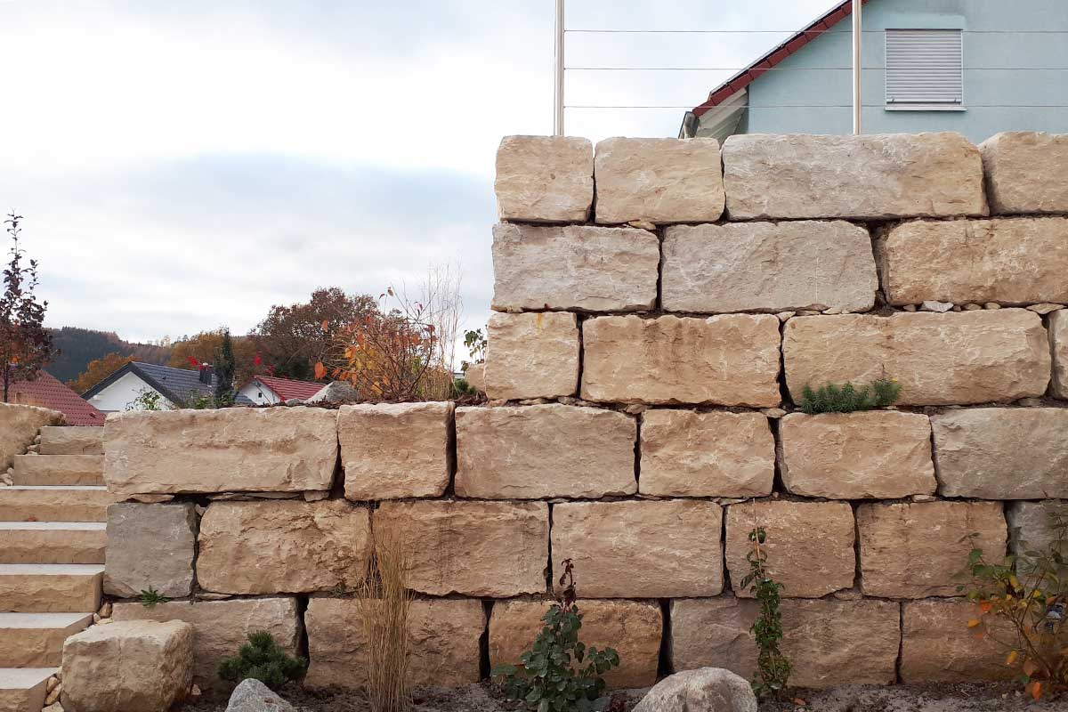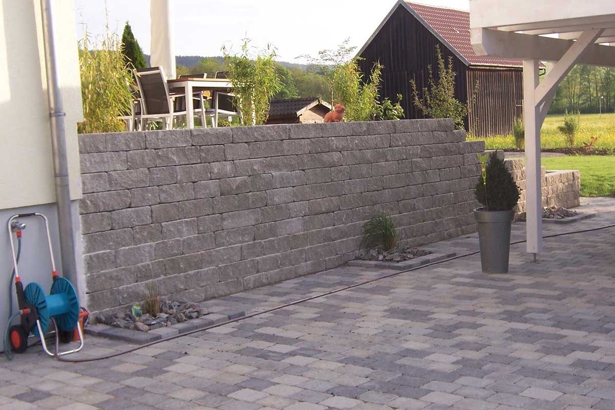 Mauern können als Trockenmauer aus Natursteinmauersteinen oder –Felsen erstellt werden und dienen zusätzlich mit den dazu passenden Pflanzen auch noch der Natur. Oder aus natursteinähnlichem Betonstein, mit oder ohne Hinterbetonierung.