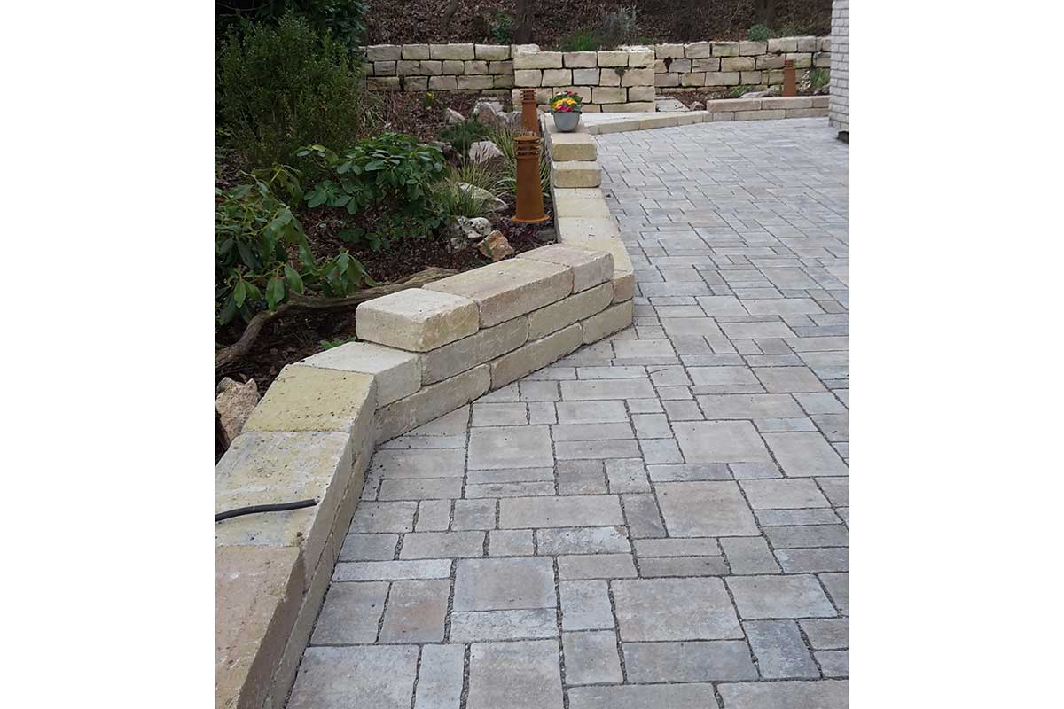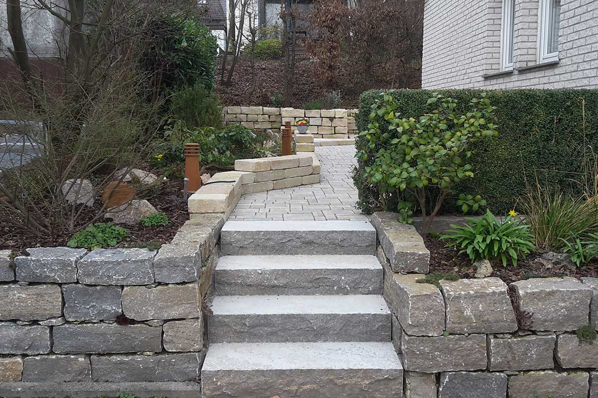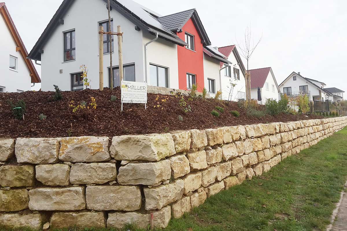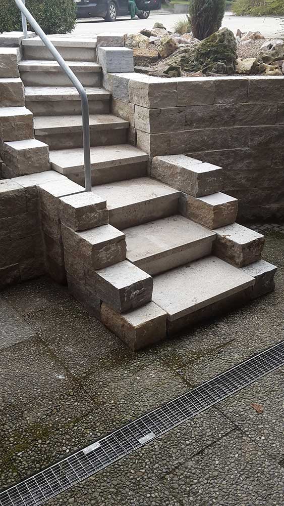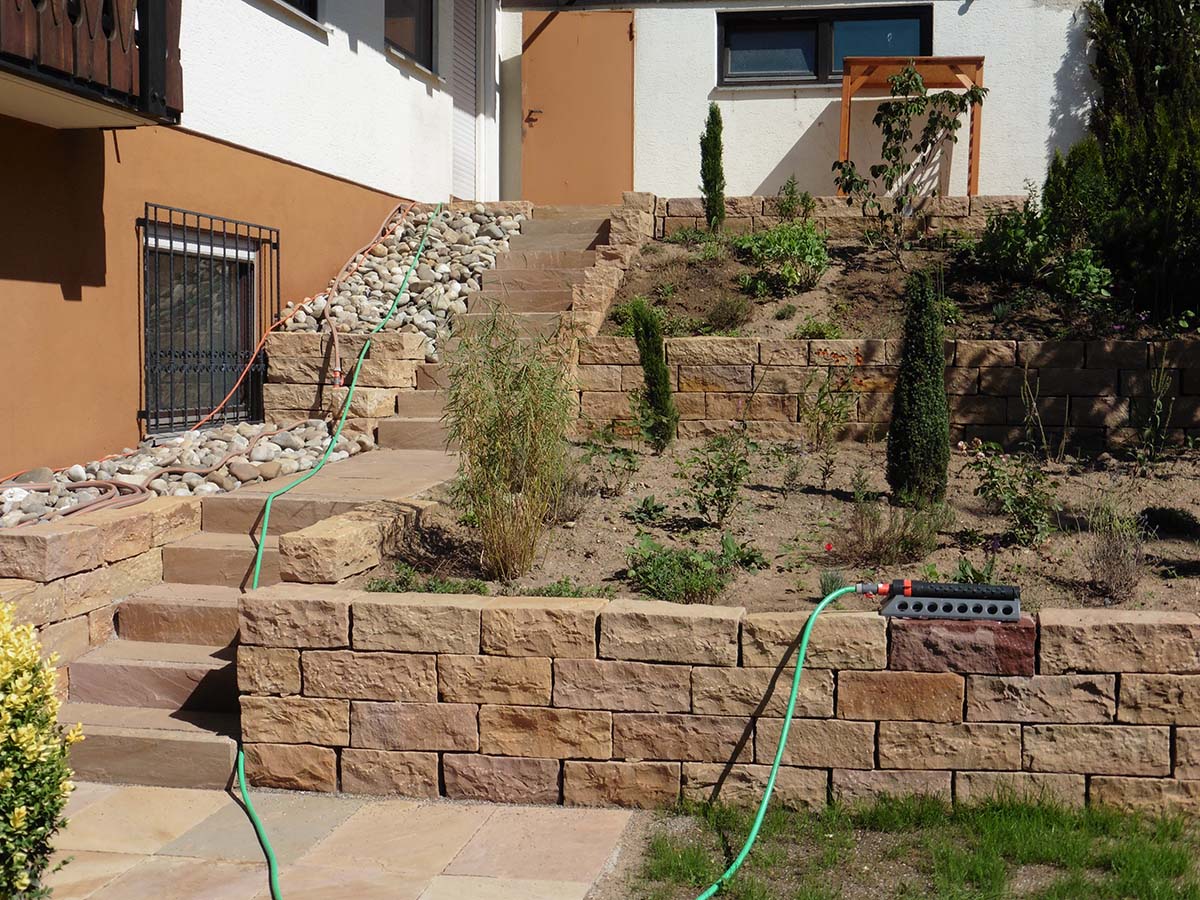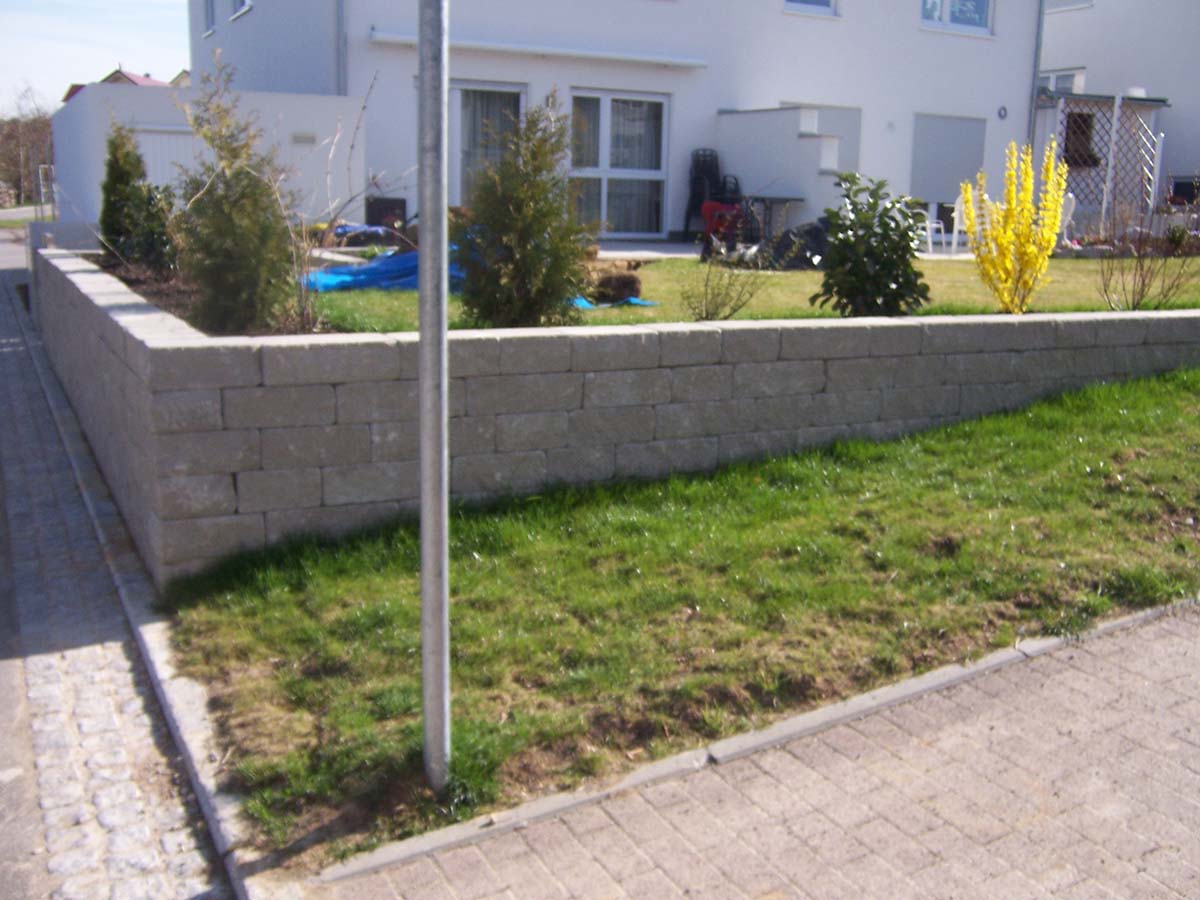 Mauern können als Trockenmauer aus Natursteinmauersteinen oder –Felsen erstellt werden und dienen zusätzlich mit den dazu passenden Pflanzen auch noch der Natur. Oder aus natursteinähnlichem Betonstein, mit oder ohne Hinterbetonierung.