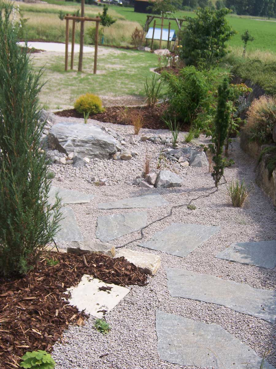 Wege erschließen den Garten. Sie führen in Gartenräume hinein und durch sie hindurch. Somit können Wege mehr sein, als nur Zweck führende Verbindungen von A nach B. Führen sie geschwungen durch den Garten, können sie zu einem abwechslungsreichen Erleben der Gartenfläche führen und immer wieder für den Besucher reizvolle Blickpunkte schaffen.